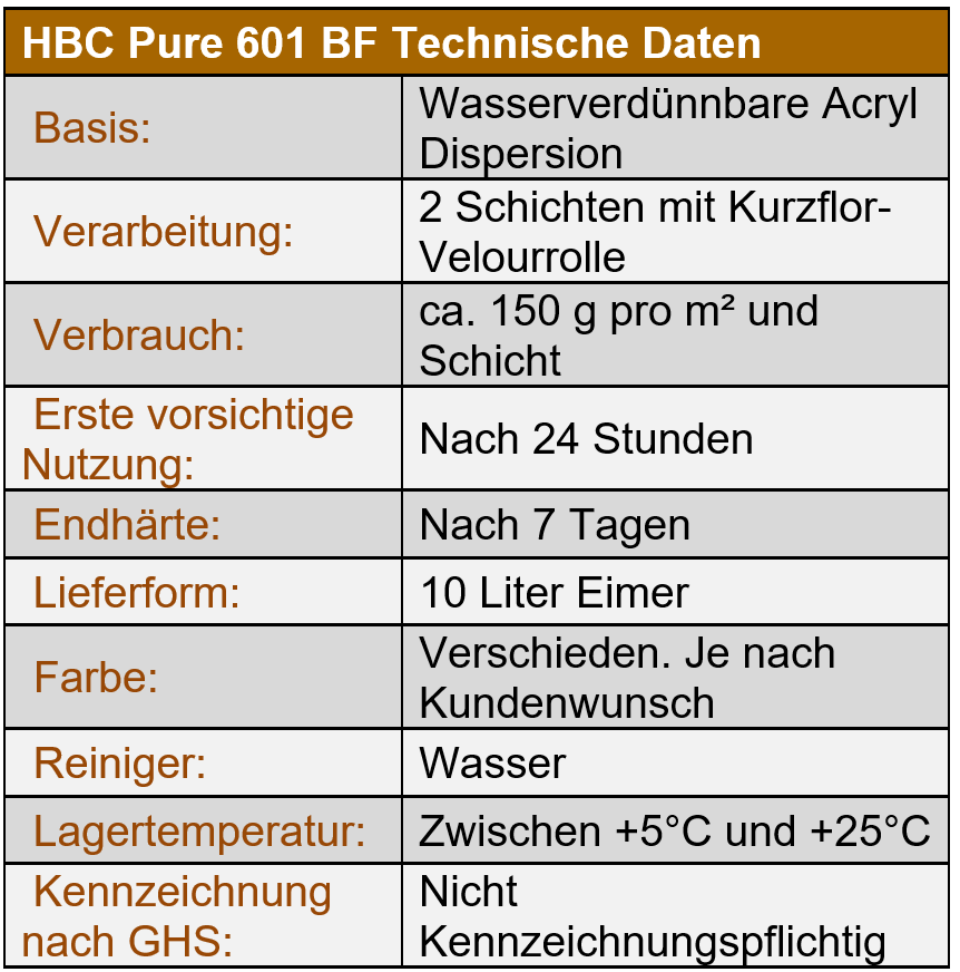 Dank der einzigartigen Eigenschaften von HBC & PURE 601 BF Acryl-Beschichtung und der eigens abgestimmten Oberflächen-Versiegelung aus Acryl fühlt sich auch Ihr Vierbeiner wohl und kann unbesorgt sein dasein geniesen. Erleichtert die Reinigung durch spezielle Beschichtungen die abrieb- und schmutzbeständig gegen Flecken sind. HBC & PURE 601 BF Acryl-Beschichtung ist ein Barfuss-Boden, den Ihre Haustiere lieben werden.