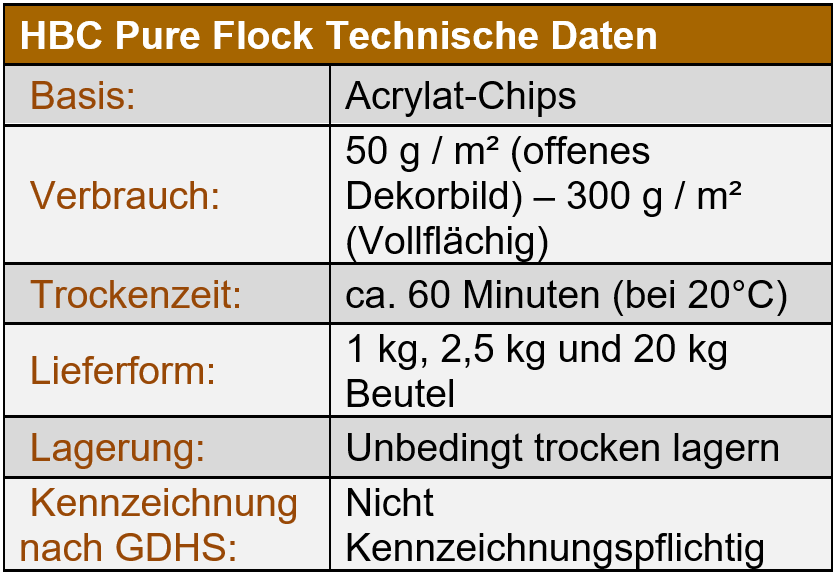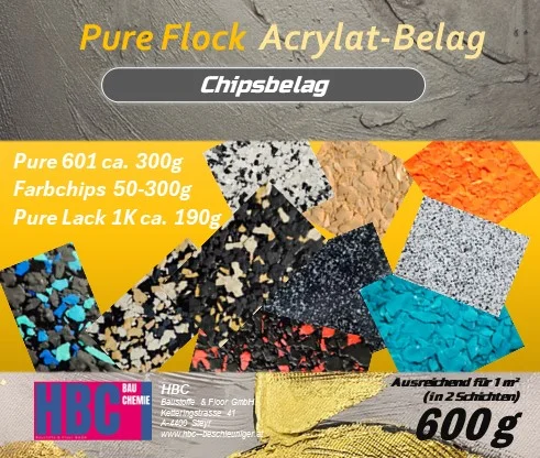 HBC & PURE FLOCK Chipsbelag ist eine individuelle und dekorative Beschichtung für Böden, Wände und Einrichtungsobjekte im innen- und Außenbereich. Das HBC & PURE FLOCK System besteht aus farbigen Acrylat- Farbchips und einer farblosen seidenglänzender Versiegelung. Durch die verschiedenen untereinander mischbaren Farben und durch farbige Untergründe können nahezu unendlich viele Muster und Farbkombinationen gestaltet werden.
