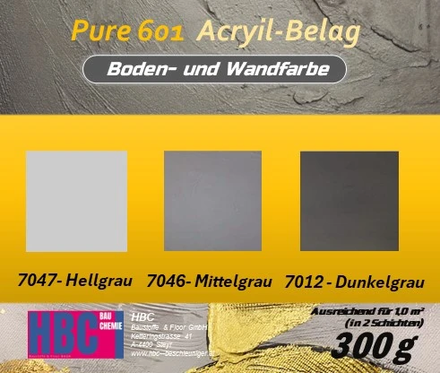 Mithilfe HBC & PURE 601 BF fugenloser Beschichtung können Sie von 3 lagernden Standardfarben Hellgrau – Mittelgrau – Dunkelgrau wählen. Optionale Farben: Weiß – Beige – Gelb – Orange – Ockerbraun – Grün und Blau sind keine Lagerware und werden je nach Kundenwunsch produziert und dauert bis zur Auslieferung ca. 2-3 Wochen.