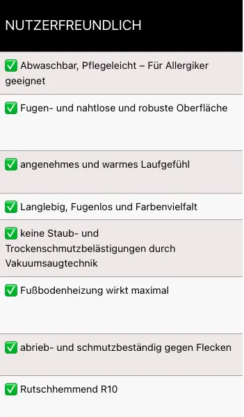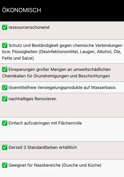 ✅ Bessere Planungssicherheit Ihrer Projekte✅ Einsparungen großer Mengen an umweltschädlichen Chemikalien für Grundreinigungen und Beschichtungen✅ angenehmes und warmes Laufgefühl