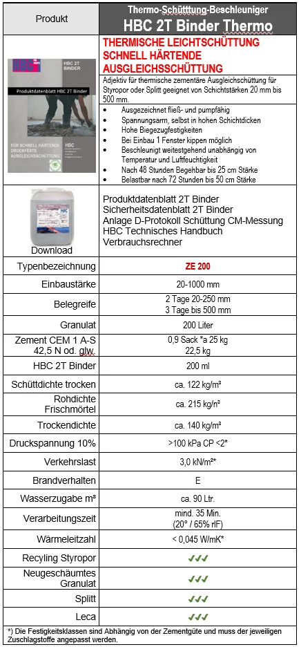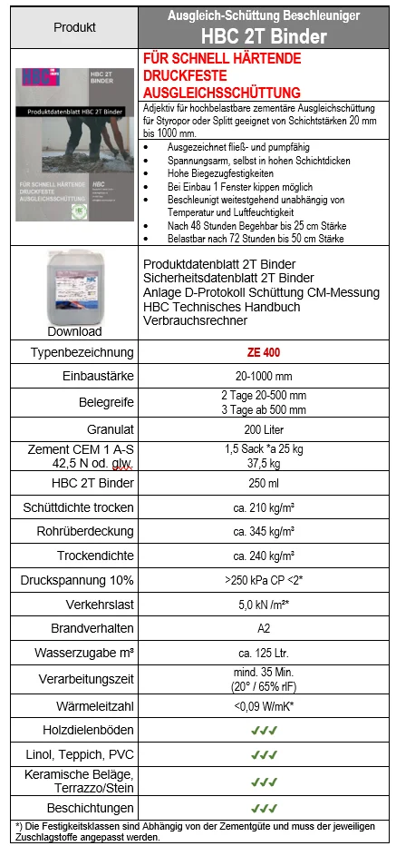 HBC 2T BINDER ist ein Spezial Binder für die Herstellung von gebundenen Wärme- und Schalldämmenden EPS-Ausgleichsschüttungen (Polystyrolbeton / Styroporbeton) sowie für gebundenes Hart Korn wie zB Blähglas, Splitt etc. unter Estrichen mit hydraulischem Bindemittel besonders zur Herstellung von Schnell-Trockenschüttungen geeignet.