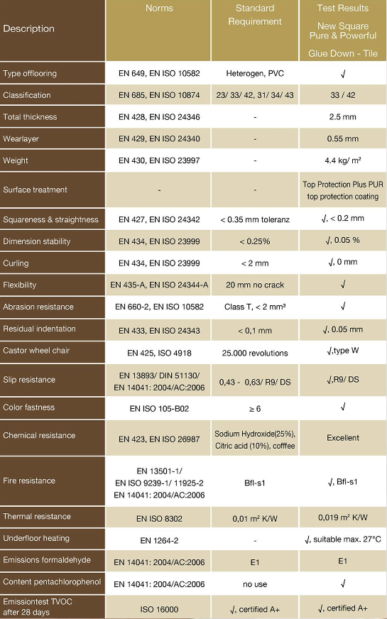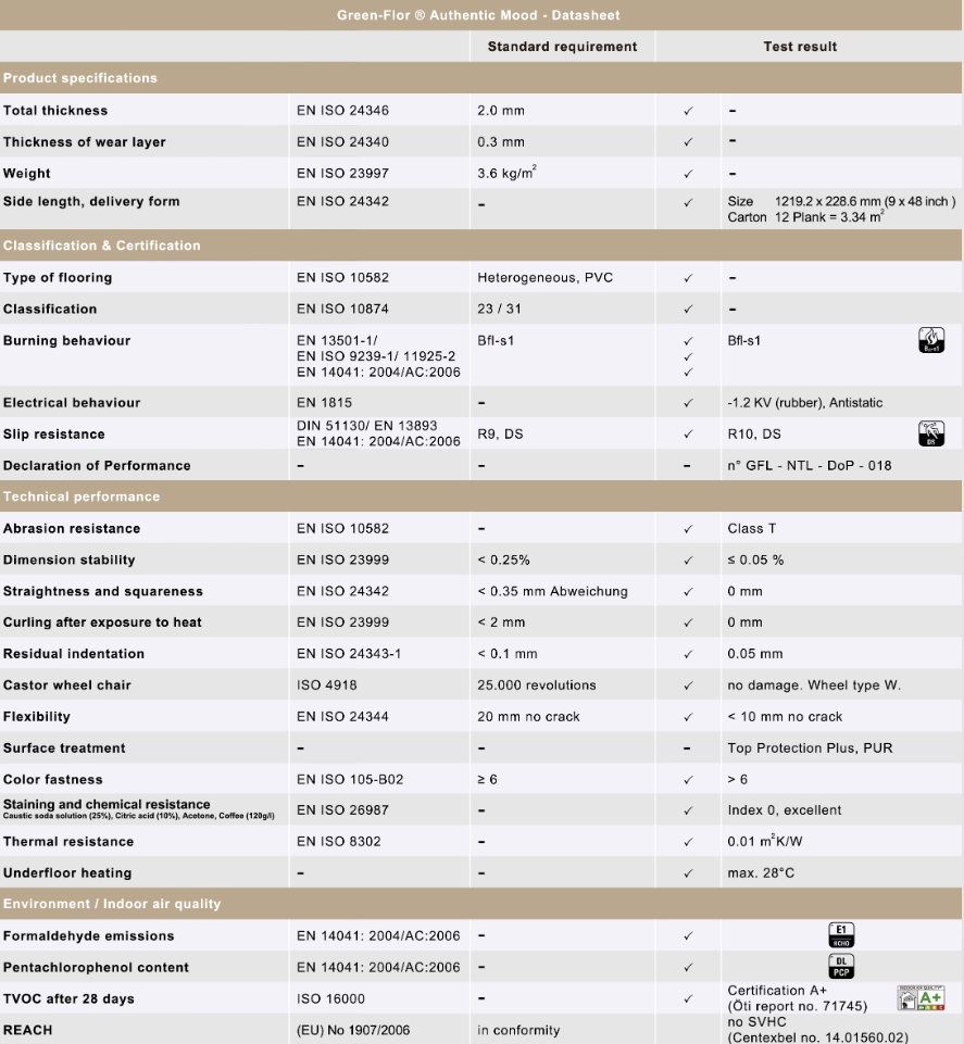 Ein innovativer Designboden auf Polypropylenbasis, der PVC -(chlor-) und weichmacherfrei ist und lediglich vernachlässigbare bis nicht messbare VOC Emissionen aufweist. Bei einem Brand werden unter optimalen Bedingungen statt toxischer Nebenprodukte lediglich CO2 und Wasser freigesetzt, was das Gesundheitsrisiko auf ein Minimum reduziert und somit einen erheblichen Vorteil ggü. Anderen, herkömmlichen Böden darstellt. Der T aber Abraser Test zeigt eine Verbessrung gegenüber herkömmlichen PVC Belägen um 75%, von 4000 Rotationen zu 7000 Rotationen. Vergleichbar mit anderen PUR basierende Böden, wird dies noch deutlicher. Der Test ergab eine Verbesserung der Abriebbeständigkeit um den Faktor 5-6!. Kombiniert mit einer realistischen und plastischen Oberflächenstruktur wird dem Boden sein natürlicher Charakter verliehen. Respecting nature & life – designed for living!