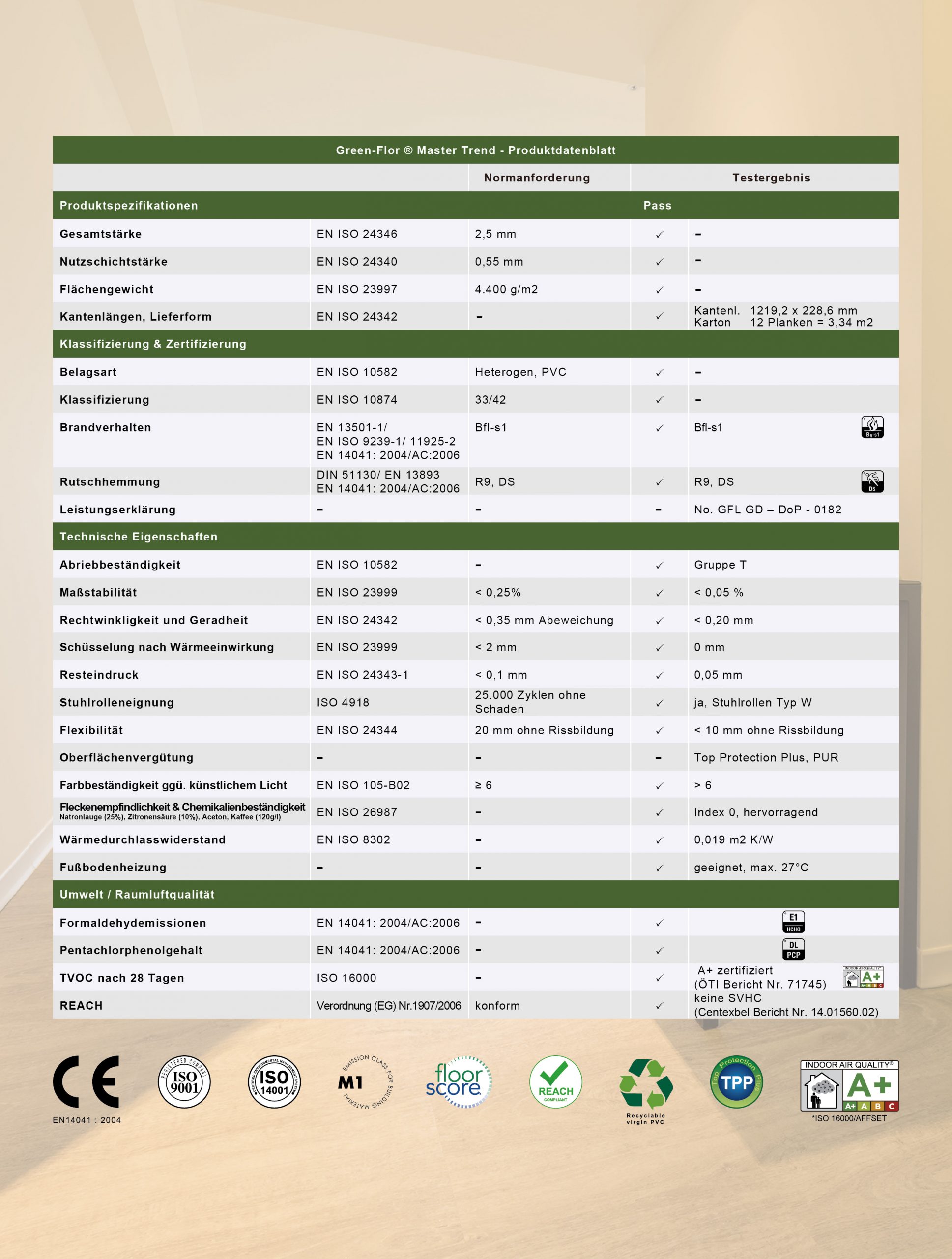 Alle Green-Flor® Produkte werden in Eigenproduktion gefertigt und in Laboren nach den höchsten Branchenstandards getestet. Zusätzlich wurden diese erfolgreich nach strikten europäischen Standards getestet. Die Produktion ist ISO 9001 zertifiziert, sodass jedes einzelne Produkt bis hin zu den verwendeten Rohmaterialien nachvollziehbar ist. Eine sorglose Nutzung und eine lange Lebensdauer ist sichergestellt. Dazu gewährt Green-Flor® 15 Jahre Gewährleistung i m Wohnbereich.
